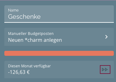 Sobald der Übertrag aktiviert wurde, startet dieser Budgetposten im kommenden Monat mit dem entsprechenden Fehlbetrag (hier -126,63 €). Außerdem wird der Fehlbetrag nicht mehr von Deinem Monatssaldo abgezogen. Du erstellst quasi ein Tor in die Zukunft, aus der Du Dir einen Geldbetrag „ausleihst“.